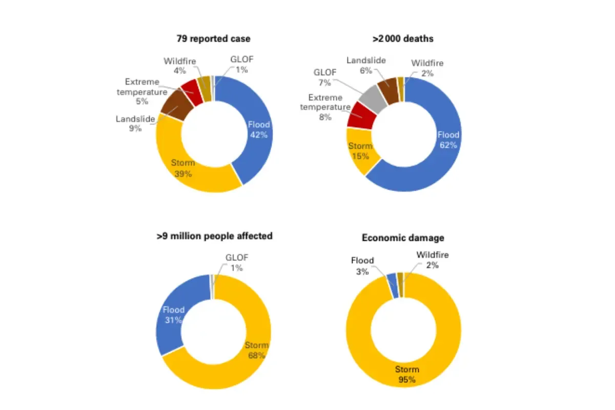 इस रिपोर्ट के अनुसार साल 2023 में जल और मौसम संबंधी खतरों से जुड़ी 79 घटनाएं हुईं, जिससे पूरे एशिया में नौ मिलियन से अधिक लोग प्रभावित हुए और सीधे तौर पर 2,000 से अधिक लोग मारे गए। इनमें से अस्सी प्रतिशत घटनाएं बाढ़ और तूफान की घटनाएं थीं। इसमें यह भी बताया गया है कि एशिया में भीषण गर्मी बढ़ती जा रही है।