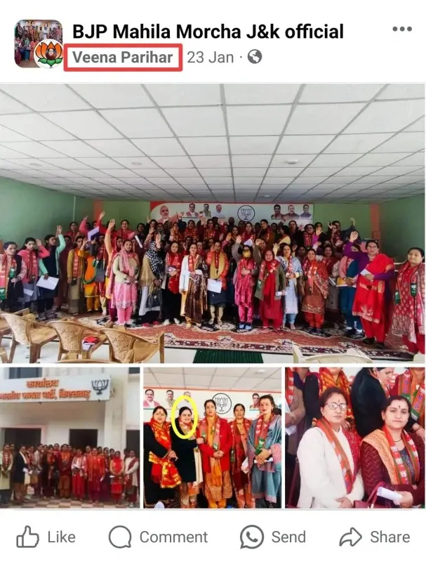 X user posted that, “Veena Devi Parihar is part of BJP Mahila Morcha. What is wrong in mentioning her party association @smitaprakash ji? On Facebook page of BJP Mahila Morcha JK official Veena Parihar used to post picture and details of meeting and her photos in BJP meetings.” He also shared a link to a video of her interaction with the Prime Minister.