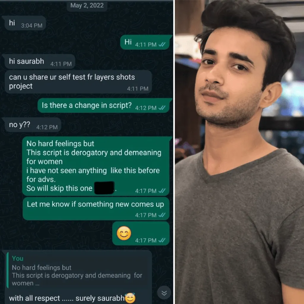As the WhatsApp screenshot along with Verma’s photograph has been made public by Mirza, Verma’s reply to the agent reads, “No hard feelings but the script is derogatory and demeaning for women. I have not seen anything like this before for advs. So will skip this one.”